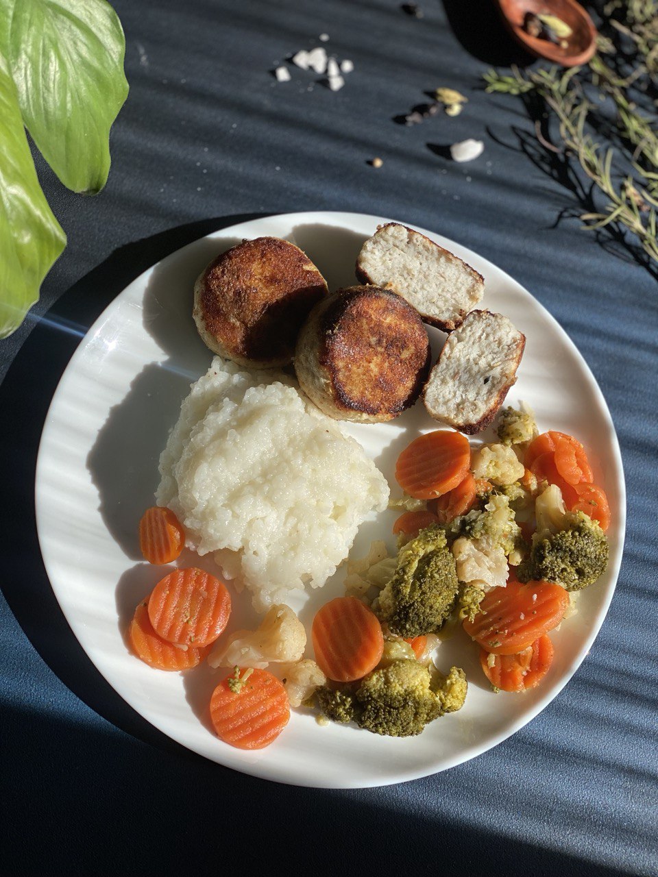 Склад: крупа рисова варена, стегно індиче, капуста білокачанна варена, цибуля ріпчаста смажена, морква смажена, олія соняшникова рафінована, сіль кухонна, кріп, перець чорний мелений.